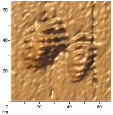 СТМ изображение 2х Парво Вирусов на поверхности монокристаллического пиралитического графита (HOPG). Скан размером 64x64 нм.
