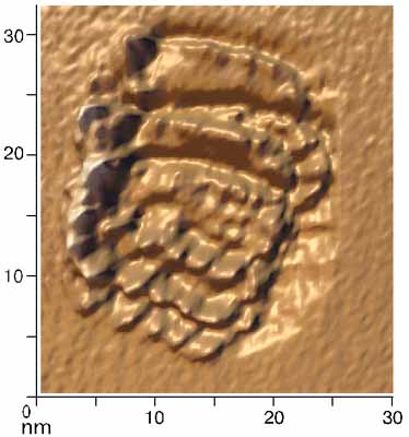 Сканирующая тунельная спектроскопия (dI/dz)I=const Парво Вируса на поверхности высоко ориентированного пиралитического графита, частота модуляции 18 кГц. Скан размером 28x32 нм.
