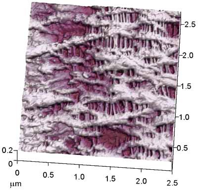 ССМ изображение мягкой полимерной мембраны. Сила воздействия на объект со стороны иглы ~ 5*10-11Н. Заметим, что при этом деформации поверхности пленки не наблюдается и хорошо видны "пржилки" в мембране. Скан размером 2.5x2.5 мкм.