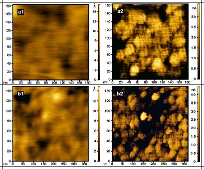 Thin dielectric film with tunnel thickness on the top of epitaxial W (10nm) film, imaged in both atomic force (a1,b1) and current modes (a2,b2) is presented in figures. Scan a1 and a2 size 185x185 nm. Scan b1 and b2 size 375x130 nm.